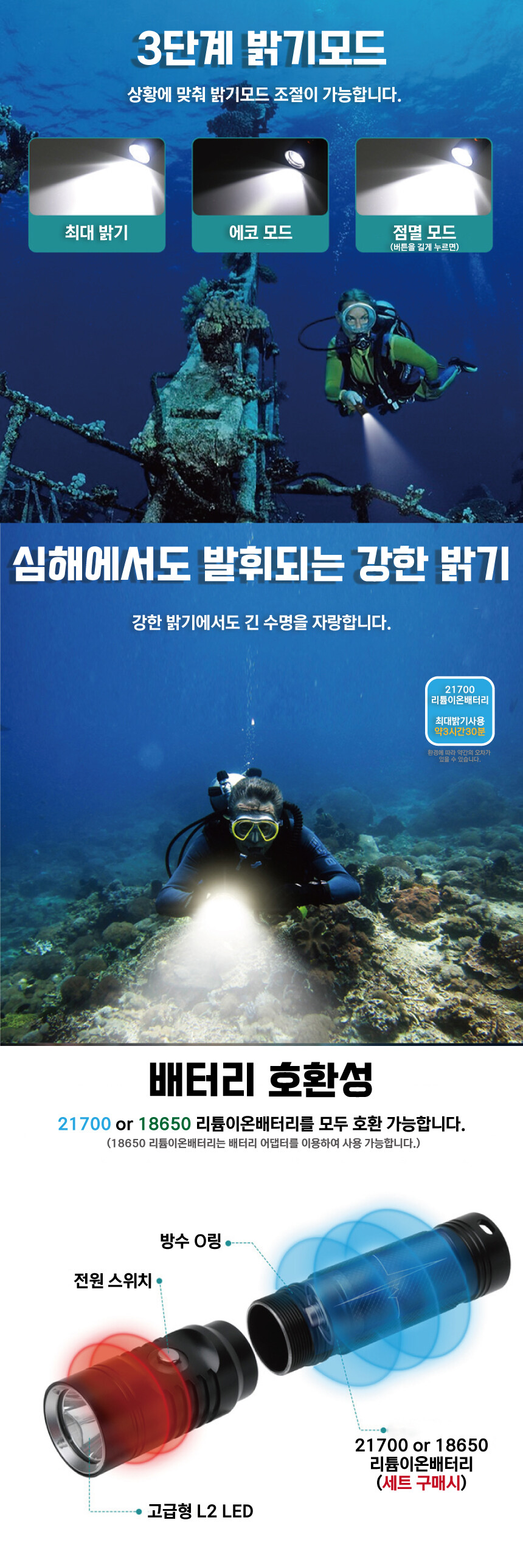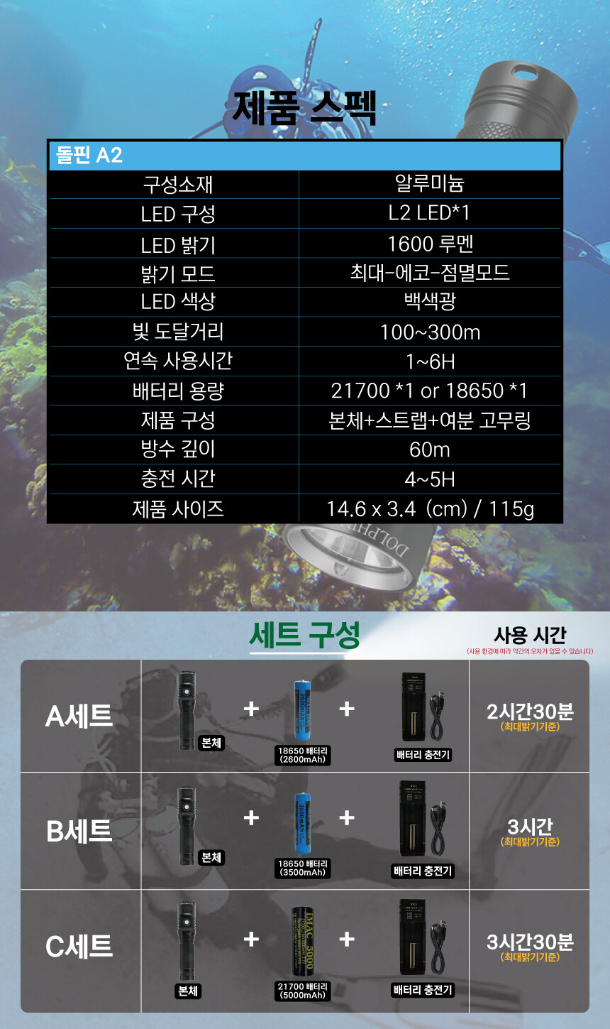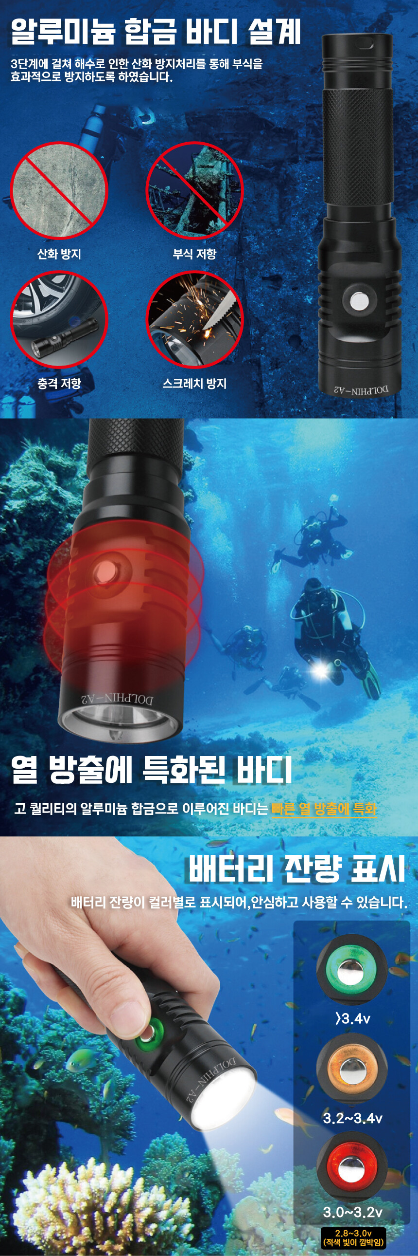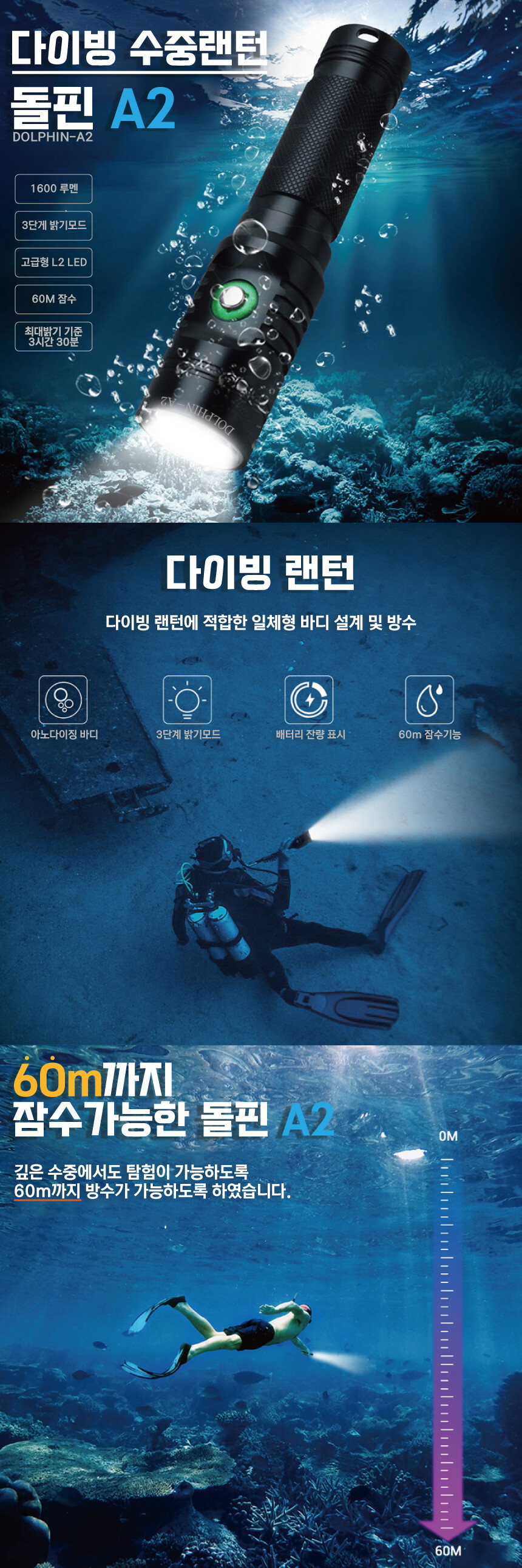 돌핀 A2 수중랜턴 1600루멘 LED 방수 다이버 해루질