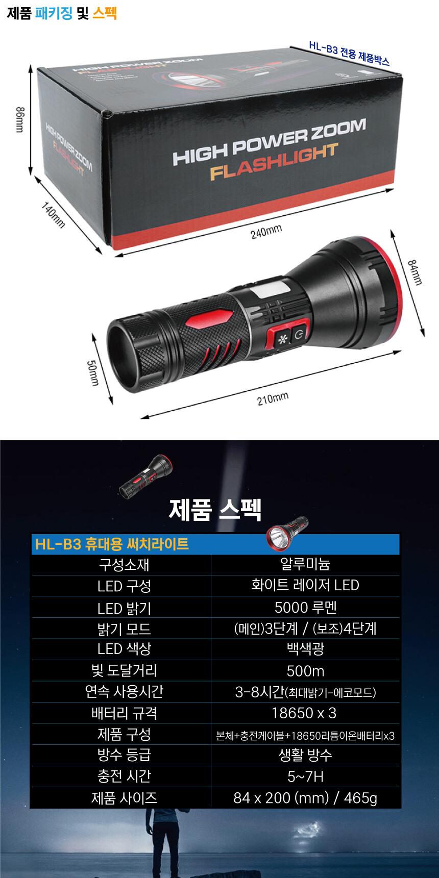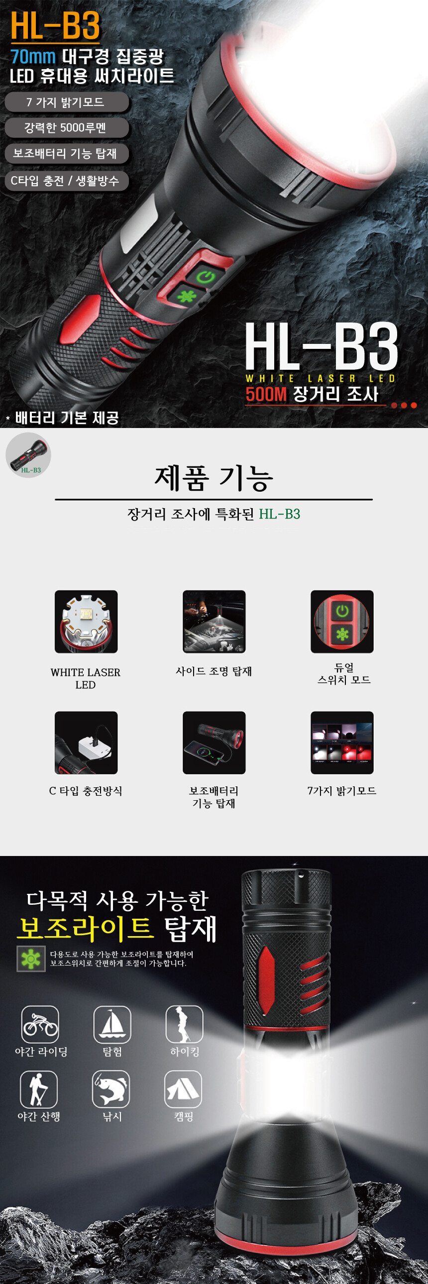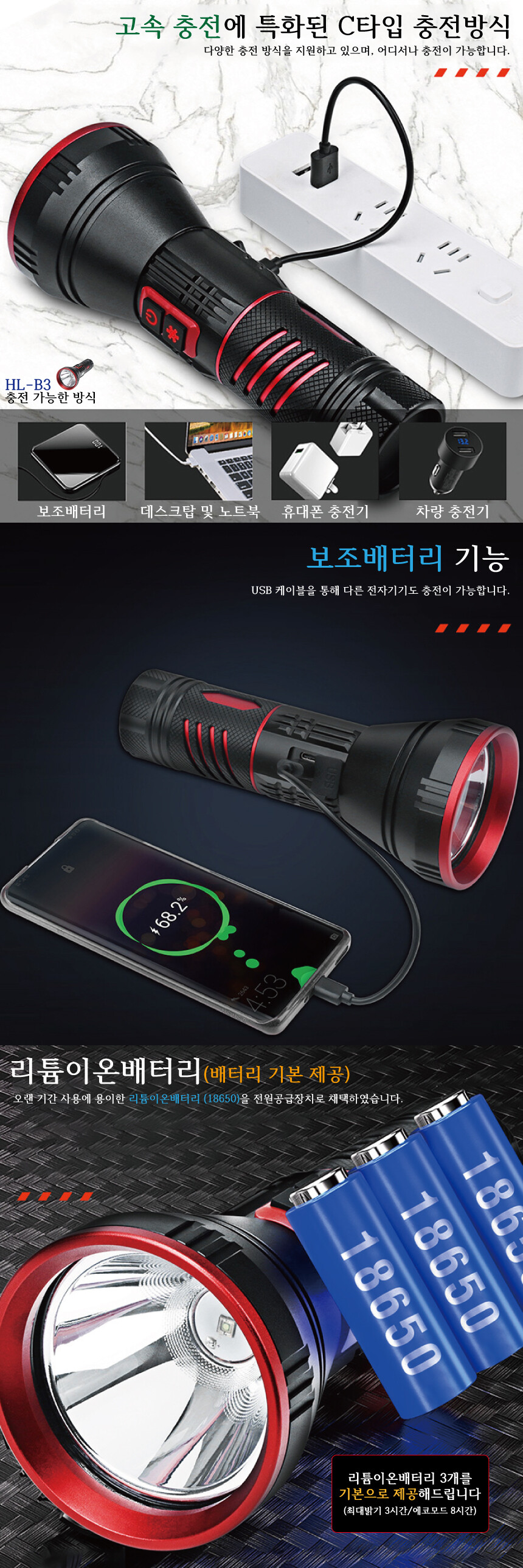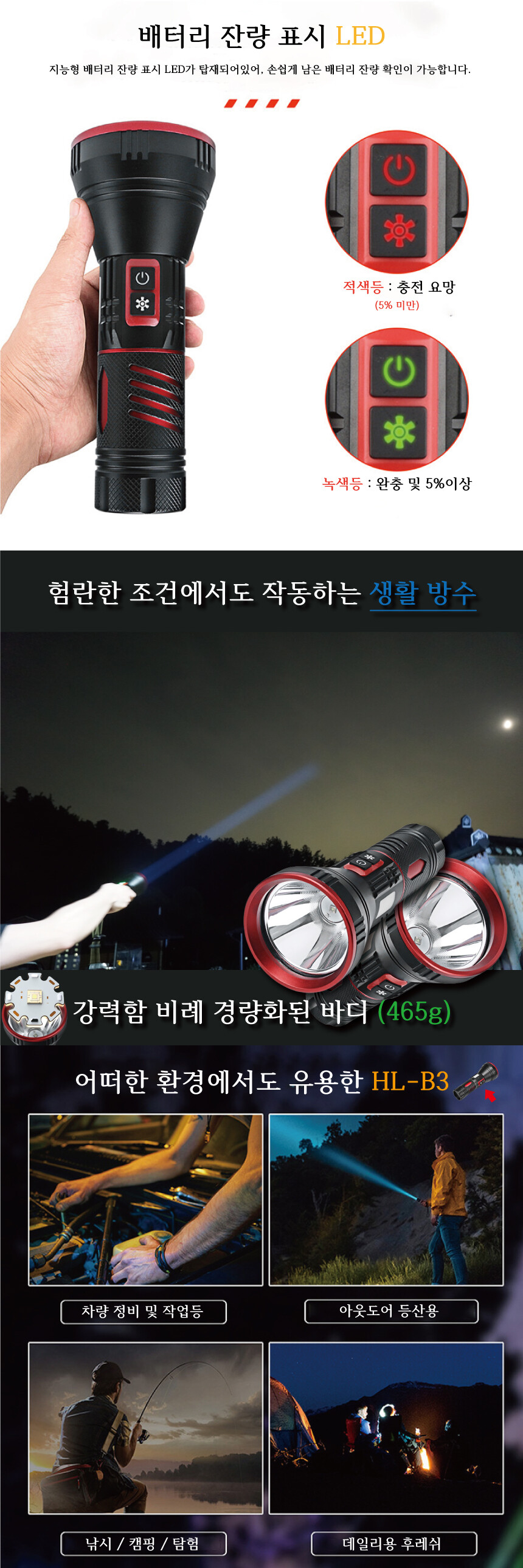 HL-B3 휴대용 LED 써치라이트 충전식 랜턴 후레쉬 후라시 강력 작업등 고휘도 해루질