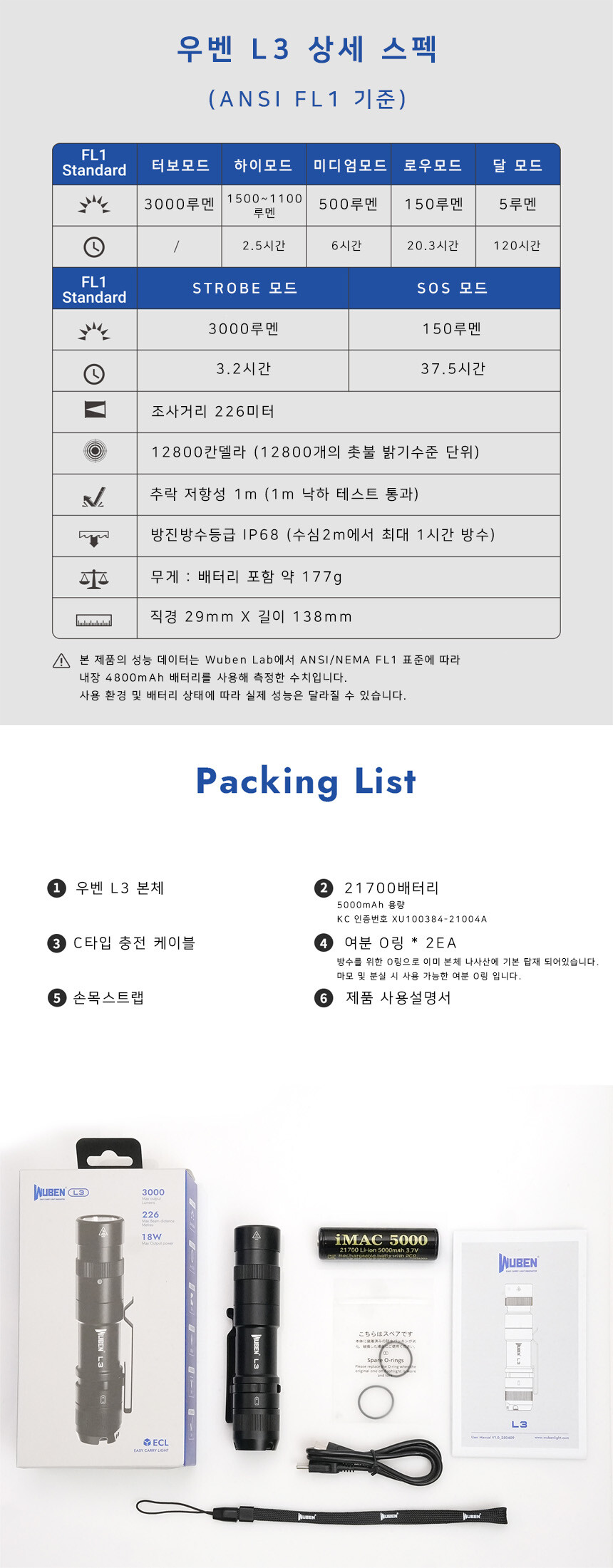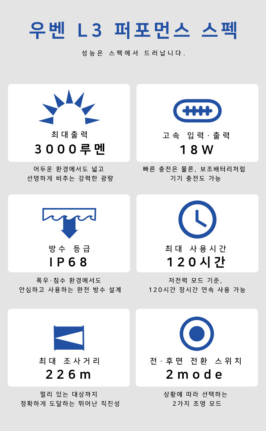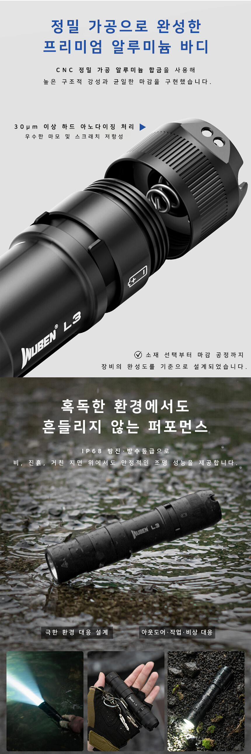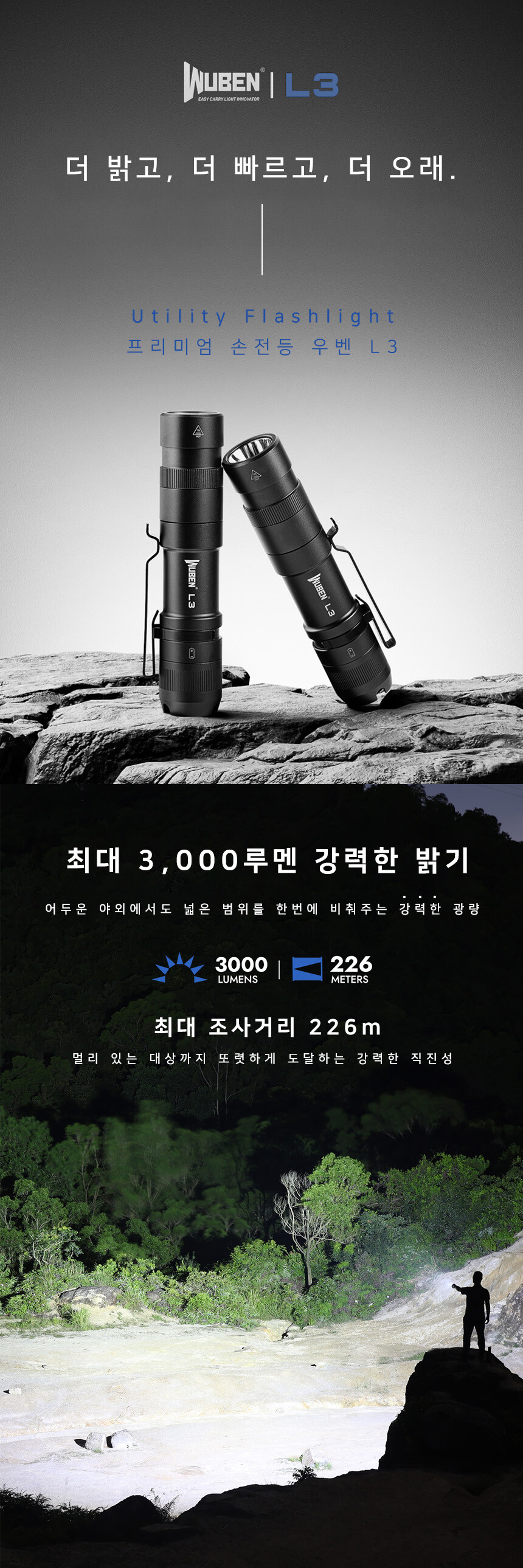 우벤 L3 LED 후레쉬 순찰 캠핑 등산 소형 C타입 충전식 라이트 랜턴